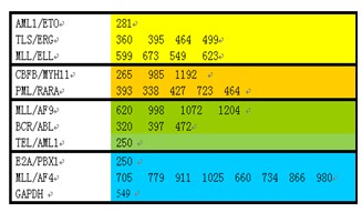 ALL+AML融合基因篩查:BCR/ABL、TEL/AML1、MLL/AF4、TLS/ERG、E2A/PBX1、AML1/ETO,PML/RARA,CBFB/MYH11、MLL/AF9、MLL/ELL
