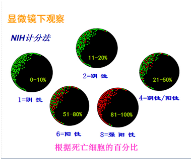 12、熒光免疫磁珠提取的細(xì)胞使用熒光終止劑5ul,加入終止劑后即可鏡下觀察,或放置數(shù)小時后觀察均可。判定分?jǐn)?shù)以NIH方法為準(zhǔn),按死細(xì)胞所占比例來定,1分陰性死細(xì)胞占1-10%,2分陰性死細(xì)胞占11-20%,4分陰性/陽性死細(xì)胞占21-50%,6分陽性死細(xì)胞占51-80%,8分陽性死細(xì)胞占81-100%。