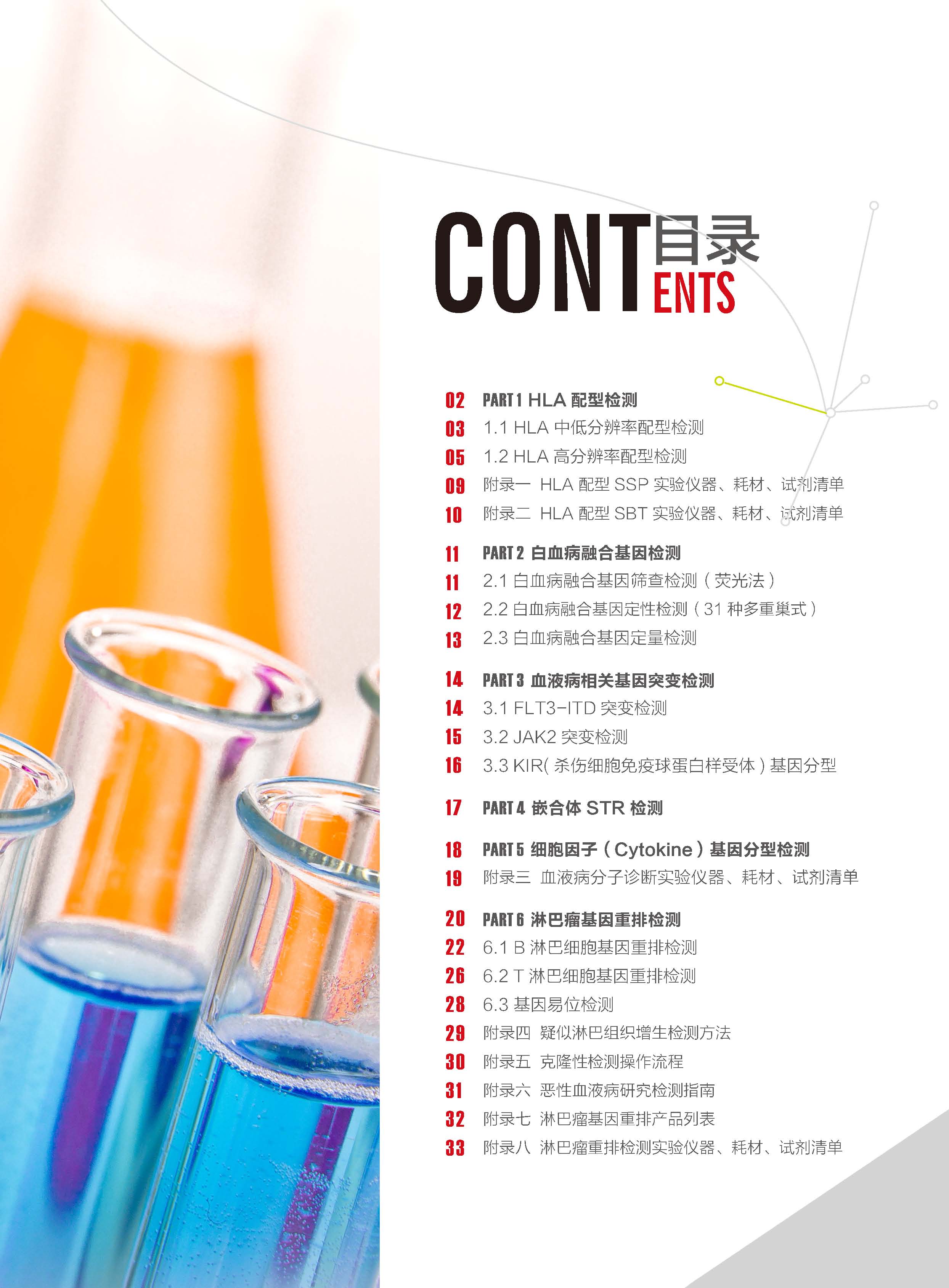 內(nèi)容包括對我公司HLA配型試劑;白血病融合基因篩查試劑、定量檢測試劑及惡性血液病預后相關的基因突變檢測試劑;嵌合體STR試劑、淋巴瘤基因重排檢測試劑、腫瘤靶向藥物基因突變檢測試劑、結直腸癌相關基因檢測試劑等的介紹,同時列出了相應診斷試劑的實驗儀器、耗材、試劑清單;惡性血液病研究檢測指南等內(nèi)容(請參見兩冊附錄部分)。具體如下: