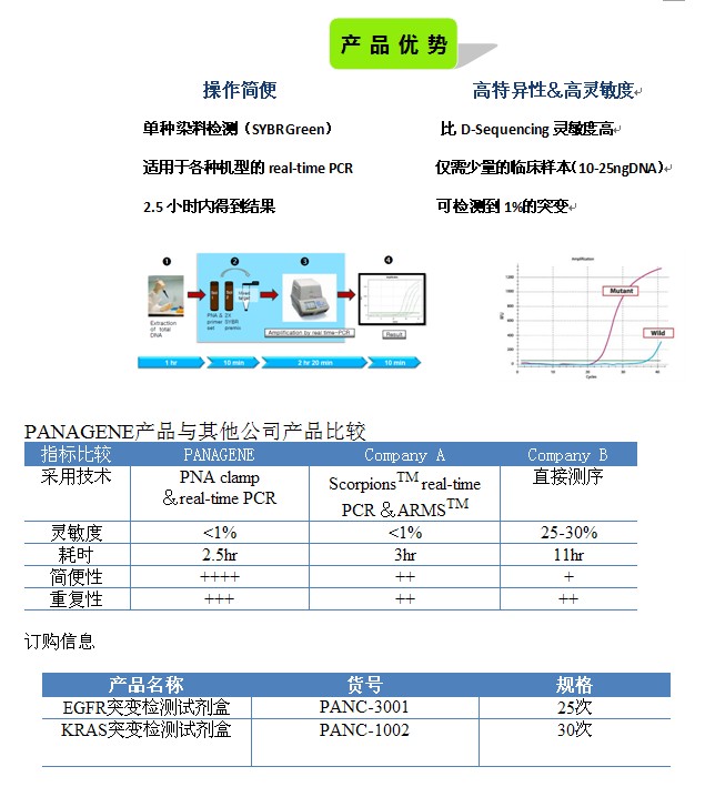 EGFR/KRAS突變檢測(cè)試劑盒均是基于PNA Clamps實(shí)時(shí)PCR技術(shù)的新 技術(shù)產(chǎn)品?稍诙虝r(shí)間內(nèi)(ca,2.5小時(shí))完成突變檢測(cè),針對(duì)臨床上少量DNA樣本也具有較高的檢測(cè)靈敏度。