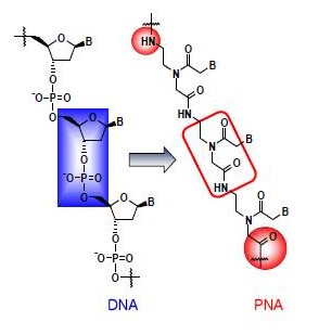肽核酸(PNA, peptide nucleic acid)是一種全新的DNA類似物,可以識別并結合DNA或RNA序列,形成穩(wěn)定的雙螺旋結構。由于PNA不帶負電荷,與DNA和RNA之間不存在靜電斥力,因而結合的穩(wěn)定性和特異性都大為提高且不被核酸酶和蛋白酶水解等。PNA可以廣泛應用于以下領域:1)miRNA抑制劑2) 反義藥物研究和治療領域 3) 分子生物和功能基因組學的工具4) 診斷用分子探針:telomere的FISH探針;Lightup探針;SNP鑒定探針;Microarray探針;Nucleic acid biosensor探針 (下圖為PNA分子結構)